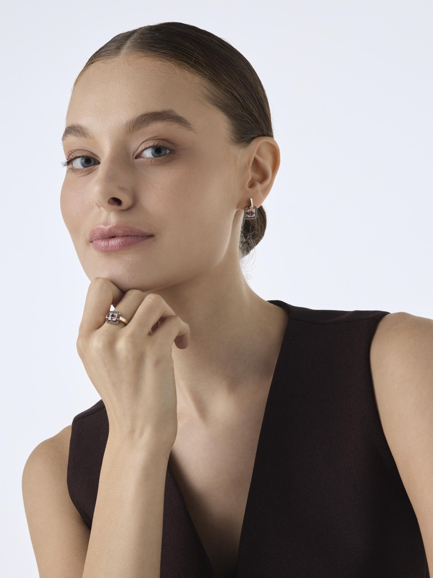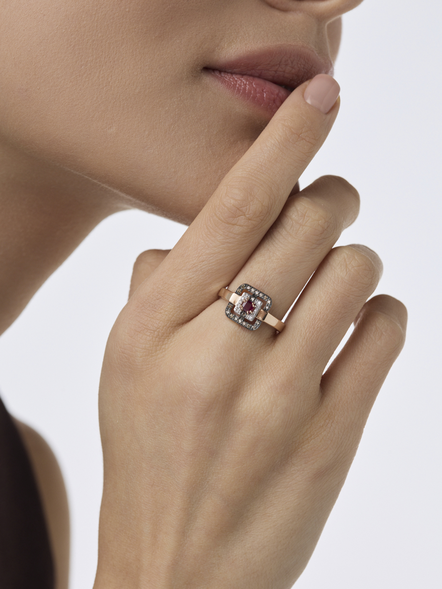 Золотое кольцо АЛЬКОР с бриллиантом, рубином и коньячным бриллиантом 16697-166
