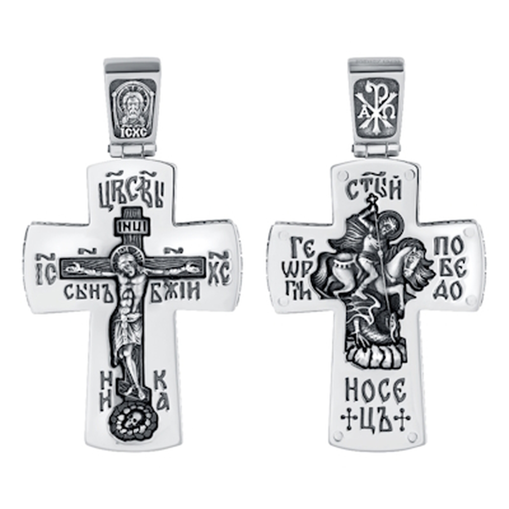 Крест с Распятием и образом святого Георгия Победоносца от мастеров ювелирного дома Иордань представляет собой важный православный символ, наполненный глубоким религиозным значением. Лицевая сторона: На лицевой стороне креста изображён образ Спасителя, наполненный величием, характерным для православной иконографии. Его фигура передает чувство объятия всего человечества, напоминая о Его крестных страданиях ради спасения людей. Над фигурой Спасителя располагается надпись "Царь Славы", подчёркивающая Его божественное величие и царскую природу. Над фигурой Спасителя находится табличка с надписью "IHЦI", что согласно преданию, была прибита по приказу Понтия Пилата и означает "Иисус Назарянин, Царь Иудейский". Слева и справа от Спасителя видны сокращения "IC XC" ("Иисус Христос") и "СЫН БОЖИЙ", указывающие на Его божественное происхождение. В нижней части креста череп и кости, символизирующие голову Адама, и надпись «Ника», что означает "Побеждающий". Оборотная сторона: На оборотной стороне