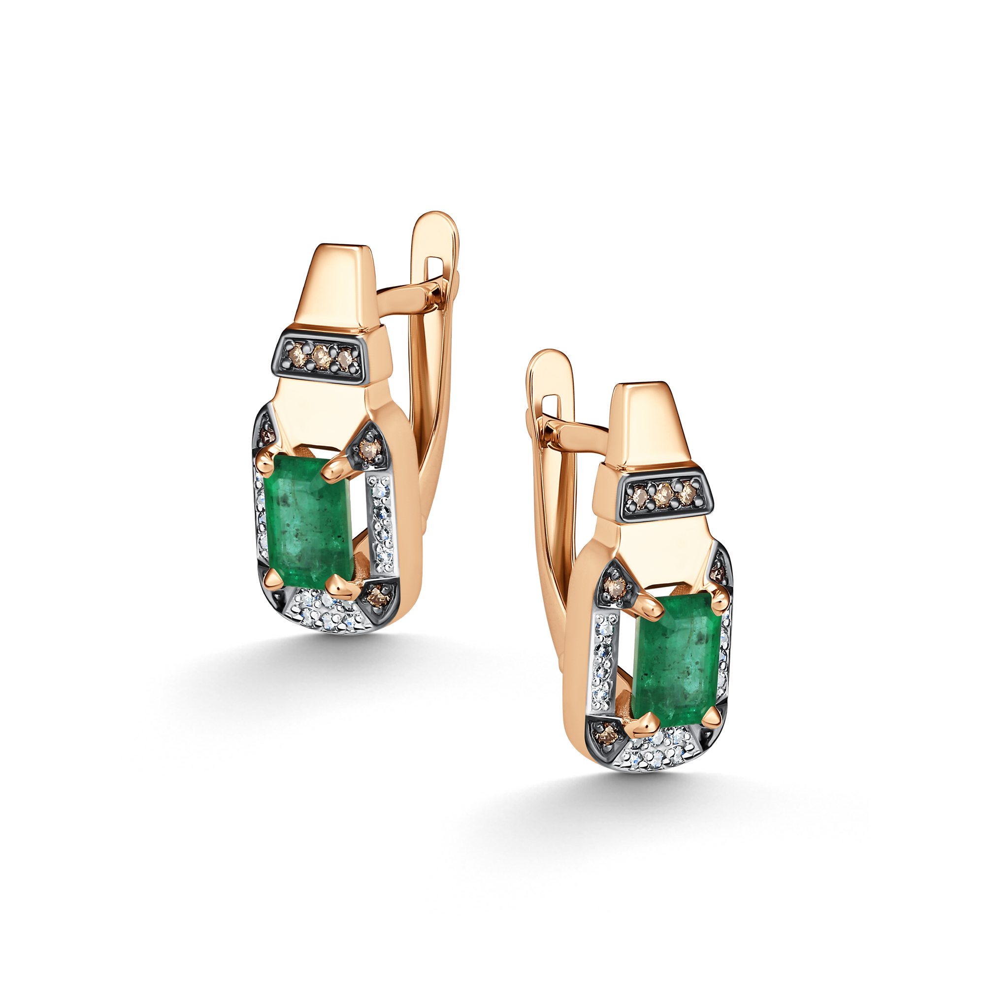 Золотые серьги АЛЬКОР с бриллиантом, изумрудом и коньячным бриллиантом 26700-165