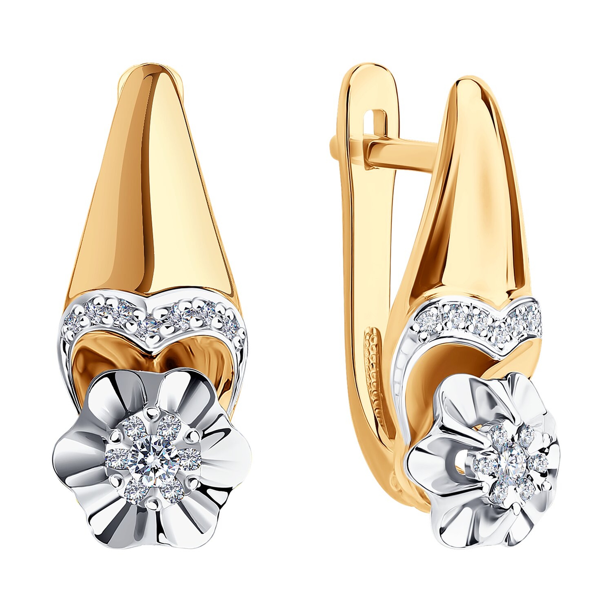 Лучшие друзья девушек – бриллианты. Точнее не скажешь. Роскошный блеск и чарующая красота драгоценного камня покорила многие сердца. В этих замечательных нежных и женственных золотых серьгах сияющий бриллиант смотрится особенно выигрышно. Романтичный дизайн и оригинальная форма несомненно привлекут внимание и восхищённые взгляды окружающих. Такие серьги будут уместны как в качестве свадебного подарка, так и просто незабываемого чувственного сюрприза любимой.